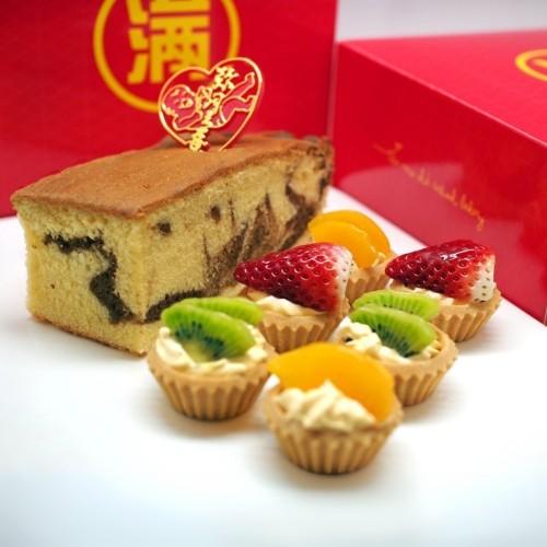 Includes 1 x Marble Butter Cake Bar, 6 x Fruit Tartlets. Packed in a red color Traditional Gift Box (est. size 8" x 8" x 3"). Minimum 12 Sets. NOTE: all cakes, pastries, ...
