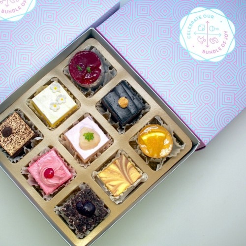 Includes 9pcs Mini Premium Cakes (flavours such as Lychee Martini, Blackforest, Triple Layer Chocolate, Raspberry Chocolate, Tiramisu, Strawberry Shortcake, Marble Cheese...