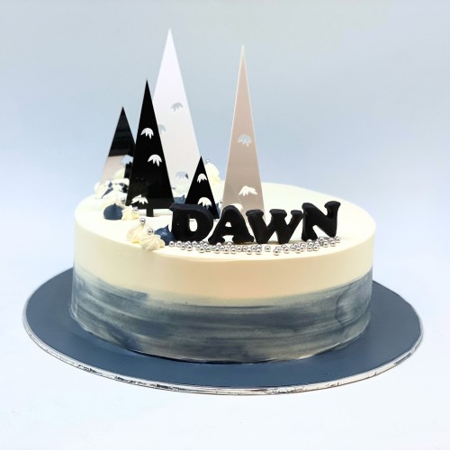 Celebrate the most wonderful month with a festive-themed cake! A snow-white plastered exterior with silver/black/white acrylic Christmas Tree toppers, and a light-up moon...