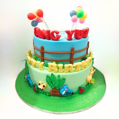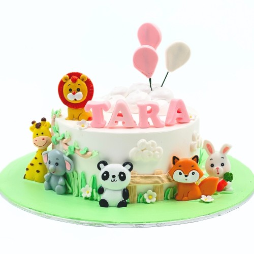 Great for animal themed party! Handpiped freshcream animals around cake, complete with plastic balloon toppers. Choose from a wide range of cake flavours (top-up to exqui...