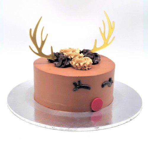 A charming reindeer design cake crafted in handpiped ivory white freshcream rosettes, giving the cake a soft, snowy elegance. Topped with gleaming gold reindeer antlers a...