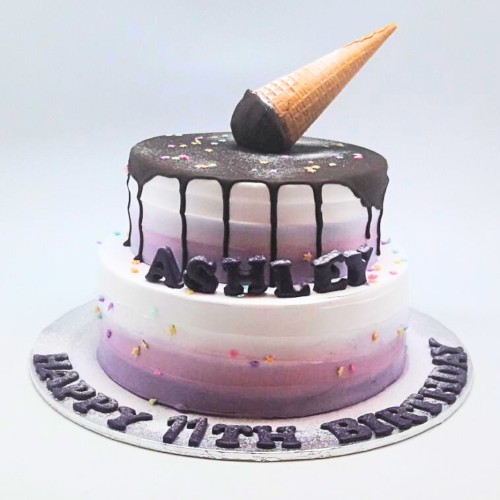 Someone dropped their ice-cream?? A playful purple ombre drip-cake design. Choose from a wide range of cake flavours (top-up to exquisite flavours such as Passion Pink Gu...