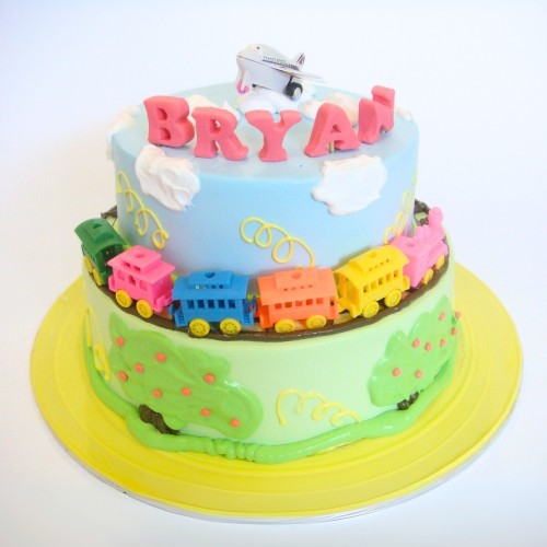 Aeroplane in the sky, Train on the ground! Trooping along to a birthday party! Choose from a wide range of cake flavours (top-up to exquisite flavours such as Passion Pin...