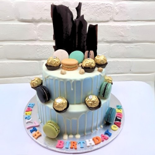 Dripping with goodness! A fun 2-tiers drip cake, decorated with macarons & Ferrero Rocher! Choose from a wide range of cake flavours (top-up to exquisite flavours such as...