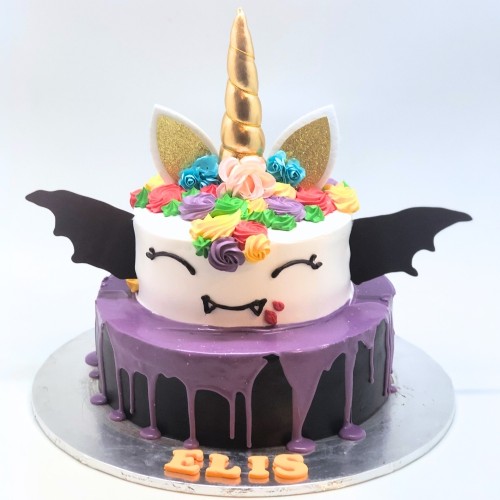 An epic Unicorn-inspired cake for this creepy month of October! Top tier designed as a cheeky vampire faced unicorn which is decorated with a fabric material unicorn horn...