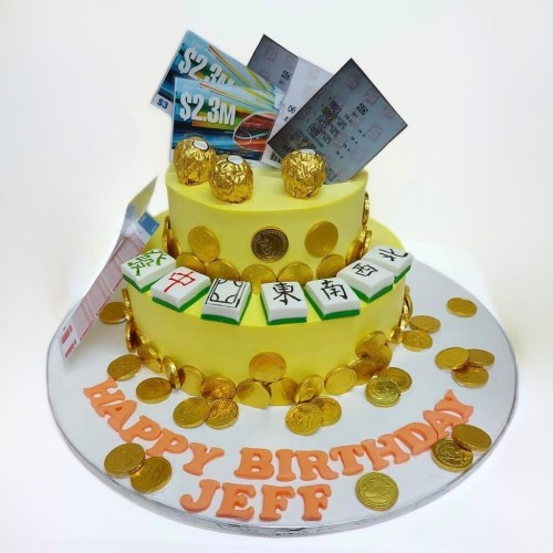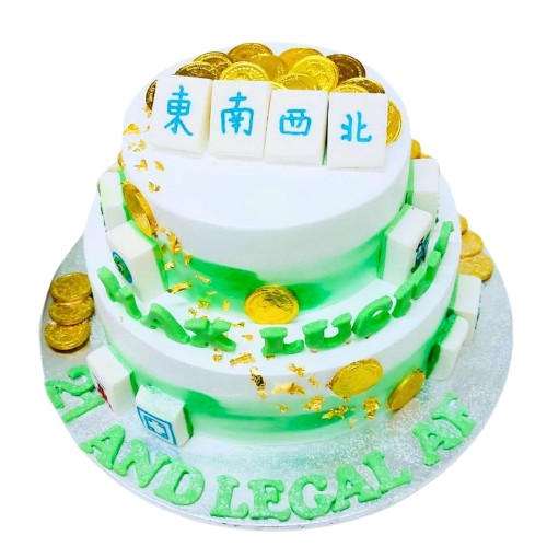 All the Huat in one cake! This celebration piece is made for high-rollers and fortune-chasers. This vibrant 2-tier cake comes decked with edible icing mahjong tiles, shim...