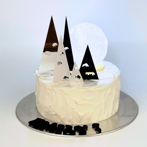 Celebrate the most wonderful month with a festive-themed cake! A snow-white plastered exterior with silver/black/white acrylic Christmas Tree toppers, and a light-up moon...