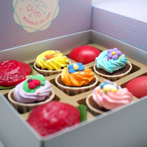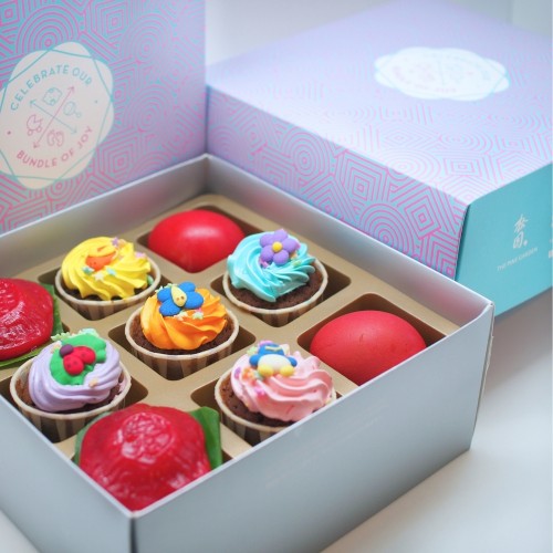 Includes 5pcs Mini Cupcakes decorated with freshcream and icing deco, 2pcs Red Eggs, 2pcs of petite-sized Ang Yi (for Boy) or Ang Ku Kueh (for Girl). Please note that all petite-sized Ang Yi and Ang Ku Kueh fillings will be green bean mung bean fillings. All items are made to order and freshly produced, however cake items in this set needs to be refrigerated, as such red eggs and ang ku kueh/ang yi will be in chilled condition during collection/delivery, recipients can reheat before consumption. Packed in a silver, blue & pink color Premium Gift Box (est. size 8" x 8" x 3"). Minimum 15 Sets. NOTE: all cakes, pastries, red eggs, ang ku kueh/ang yi, glutinous rice, etc needs to be refrigerated. Alternatively, you can keep in air-conditioned environment for up to 3-4hours. For urgent order of less than 7days notice, or if you require less than the stated minimum quantity, please contact us at 64576159 or enquiries@pgcake.com for assistance.