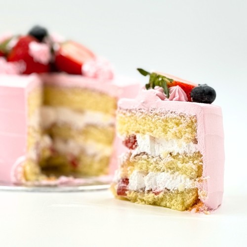 Our Fresh Strawberry Cream Cake features layers of moist vanilla cake, filled with fresh cut strawberries and luscious fresh cream. Perfect for any occasion, each bite offers a harmonious blend of sweet, juicy strawberries and creamy goodness. Experience the freshness and elegance of this classic cake, designed to satisfy your cravings. For urgent order of less than 3days notice, please contact us at 64576159 or enquiries@pgcake.com for assistance.