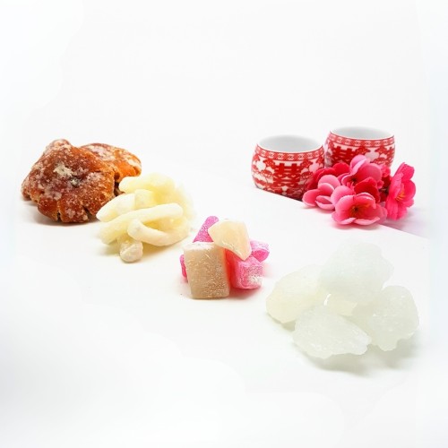 Includes 1kg Rock Sugar, 1kg Pink & White Chewy Candies, 1kg Candied Wintermelon Strips, 1kg Dried Tangerine Slices. For urgent order of less than 7days notice, or if you require less than the stated minimum quantity, please contact us at 64576159 or enquiries@pgcake.com for assistance.