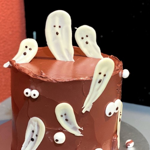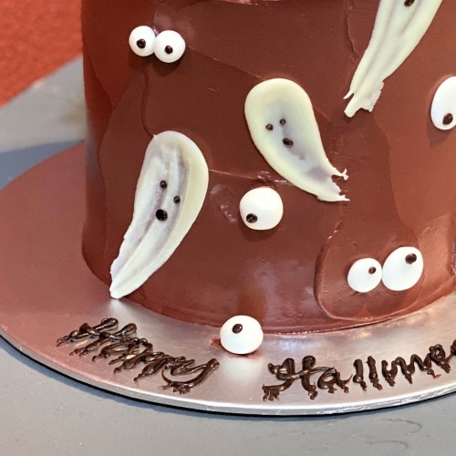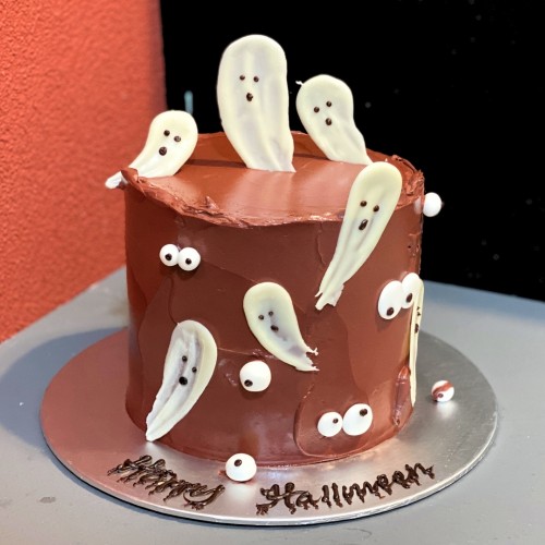 Ghouls just want to have fun! A cheeky creation for all fun-loving October babies! This is a tumbler shaped cake (2 cakes stacked up to make it taller) coated with chocolate buttercream on the exterior and decorated with chocolate/icing ghosts and eyeballs. Choose from a wide range of cake flavours (top-up to exquisite flavours such as Passion Pink Guava, Rambutan Osmanthus Yogurt, Strawberry Milk-Shake Panna Cotta, Grapefruit Oolong, Yakult Soju, etc available, contact our team for assistance). For further customisation request, please contact 6457 6159. Delivery service available at $18 per trip, waived for orders above $280. For urgent order of less than required notice period, please contact us at 64576159 or enquiries@pgcake.com for assistance.