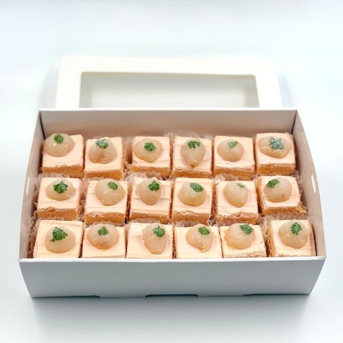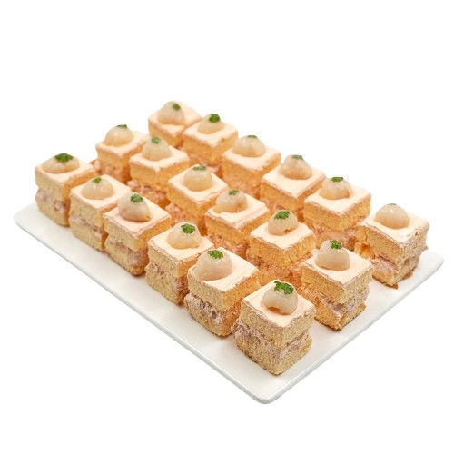 Indulge in our top seller selection of mini desserts and bites, these mini cake box is a perfect add-on to complement your gathering. Our signature creation; Lychee Martini! Indulge in a bite of tropical luxury with this box of mini Lychee Martini Cakes. This exquisite creation features a delicate lychee sponge cake, perfectly balanced with layers of martini-soaked lychees that add a sophisticated twist. Each bite is a harmonious blend of fruity freshness and light freshcream decadence. Mini cakes is approx. 1.5" x 1.5".