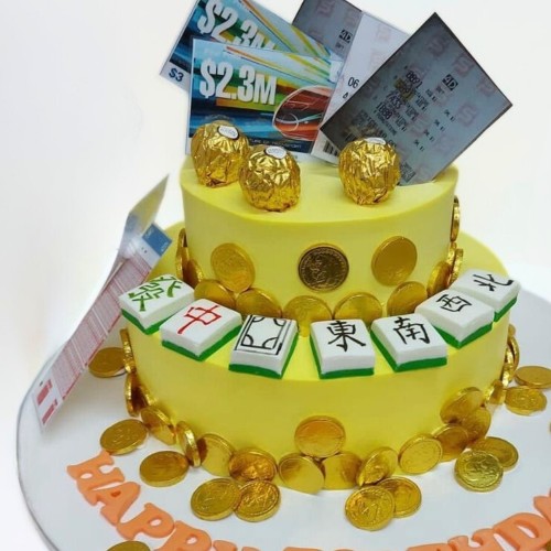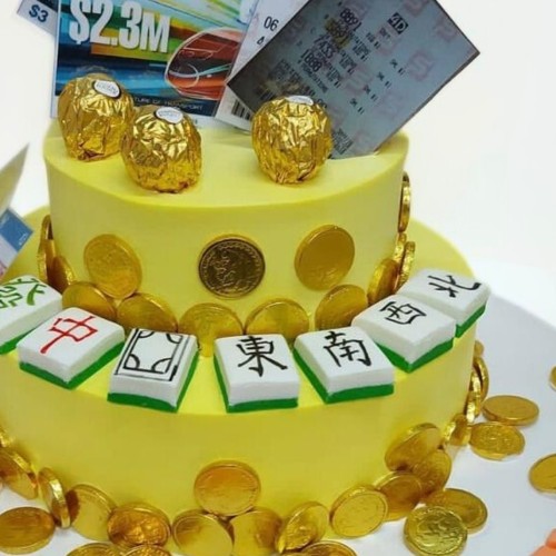 All the Huat in one cake! This celebration piece is made for high-rollers and fortune-chasers. This vibrant 2-tier cake comes decked with edible icing mahjong tiles, shimmering chocolate gold coins & Ferrero "gold balls", and lucky lottery & 4D tickets — a playful symbol of prosperity, wealth and huat-ness all year long. Perfect for birthdays with big dreams, bigger ambitions, and a taste for winning streaks! 麻将好运到!Choose from a wide range of cake flavours (top-up to exquisite flavours such as Passion Pink Guava, Rambutan Osmanthus Yogurt, Strawberry Milk-Shake Panna Cotta, Grapefruit Oolong, Yakult Soju, etc available, contact our team for assistance). For further customisation request, please contact 6457 6159. Delivery service available at $18 per trip, waived for orders above $280. For urgent order of less than required notice period, please contact us at 64576159 or enquiries@pgcake.com for assistance.
