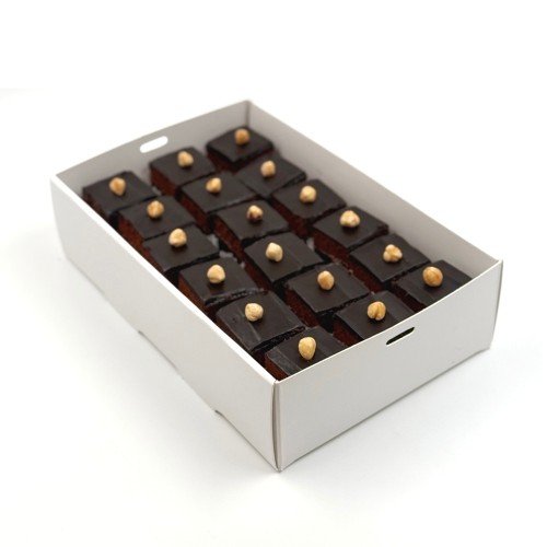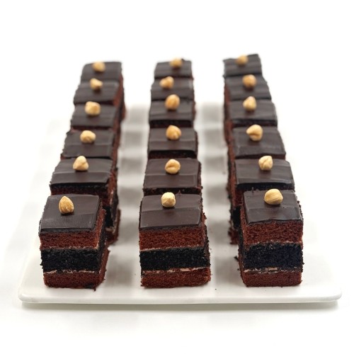 Indulge in our top seller selection of mini desserts and bites, these mini cake box is a perfect add-on to complement your gathering. Pure chocolate bliss with our Triple Layer Chocolate Cake. Crafted from the German-imported chocolate, this velvety dessert features layers of soft chocolate cake with a dense chocolate layer, creating a symphony of richness and textures. Perfect for chocoholics, each bite offers an satisfying chocolate experience for any chocolate lover. Mini cakes is approx. 1.5" x 1.5".