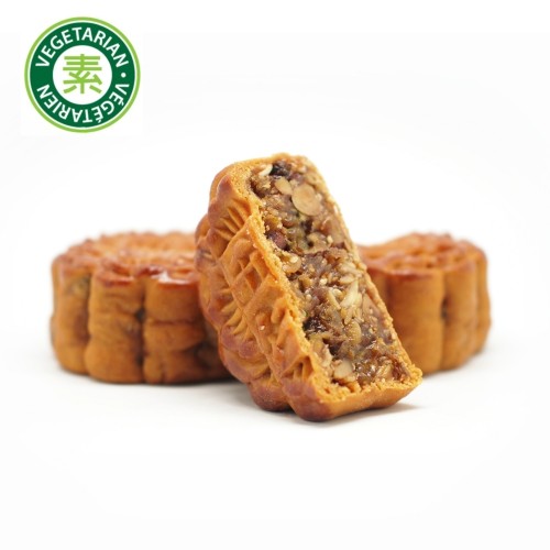 A timeless treasure steeped in tradition, this signature flavour is lovingly crafted using The Pine Garden’s cherished family recipe. At its heart is a rich medley of premium walnuts, almonds, bitter almonds, sesame seeds, and melon seeds, delivering a satisfying crunch and natural depth in every bite. Infused with the fragrant zest of Chinese candied citrus peel and delicate strips of winter melon, this mooncake strikes a beautiful balance of earthy, nutty richness and bright, aromatic sweetness. Each slice is a nod to heritage and craftsmanship — a celebration of flavour and texture that resonates with those who appreciate the beauty of tradition, lovingly preserved. This is a VEGETARIAN version without egg content. Price stated is for 1pc of Mooncake. Every 4pcs of Mooncake will be packed in 1 Premium Box, so feel free to mix and match flavours for each box. Please note all mooncakes are handmade with no preservatives and we recommend consumption within 1 to 1.5weeks from collection. Available for collection ONLY from 02 Oct to 06 Oct '25.