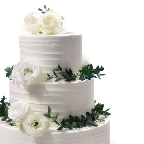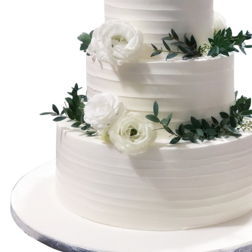 A timeless white 3-tier wedding cake with a textured line finish. This cake is crowned with sprigs of ruscus and lovely fresh white eustomas. NOTE: Fresh floras are seasonable and may be subjected to changes and stock availability. Further customisation options (e.g. Number of tiers, colours, finishes) and priority delivery available, subjected to availability. Please email us at enquiries@pgcake.com for more details.