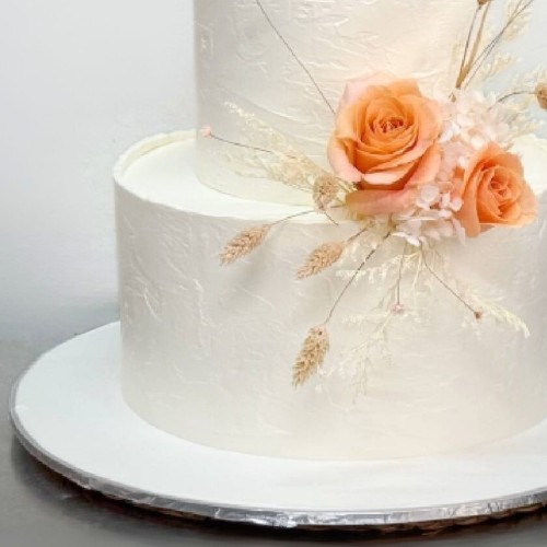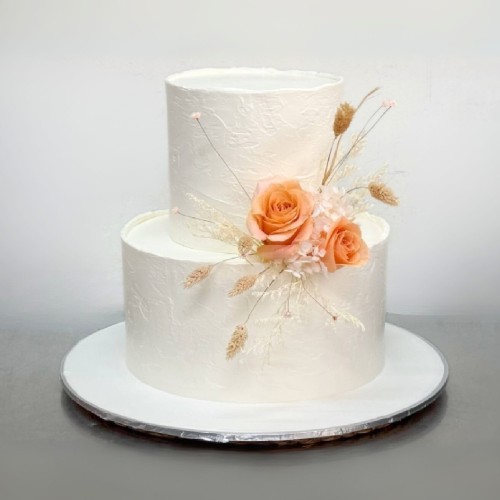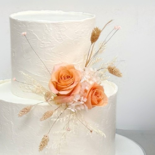 The cake features elegantly rough, textured edges for a raw, natural look, balanced by soft, neutral tones and delicate details. Adorned with preserved dried florals, and subtle neutral peach accents, it perfectly blends bohemian charm with luxurious touches, creating a romantic yet effortlessly chic centerpiece for the celebration. NOTE: Preserved floras may be subjected to changes and stock availability. Further customisation options (e.g. Number of tiers, colours, finishes) and priority delivery available, subjected to availability. Please email us at enquiries@pgcake.com for more details.