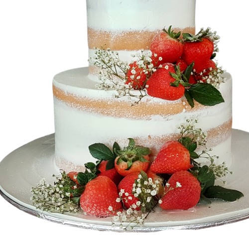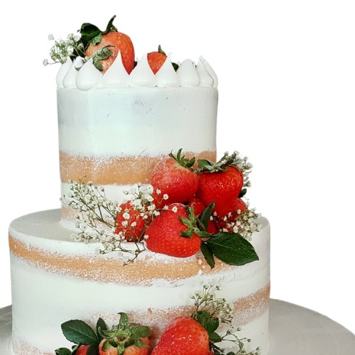 A rustic semi-naked 2-tier wedding cake decorated with fresh strawberries with baby's breaths for that floral touch. NOTE: Fresh floras are seasonable and may be subjected to changes and stock availability. Further customisation options (e.g. Number of tiers, colours, finishes) and priority delivery available, subjected to availability. Please email us at enquiries@pgcake.com for more details.